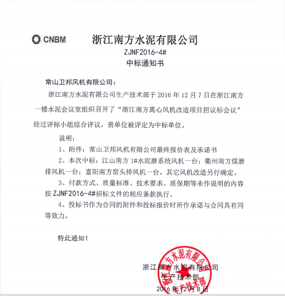 我公司中标浙江南方水泥有限公司风机节能改造项目